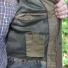 Élégante, ce blouson ne dispose pas d’empiècements, mais différentes nuances de kaki sont présentes au niveau des rabats des poches, sous les bras, sur la poche poitrine et dans le bas du blouson.